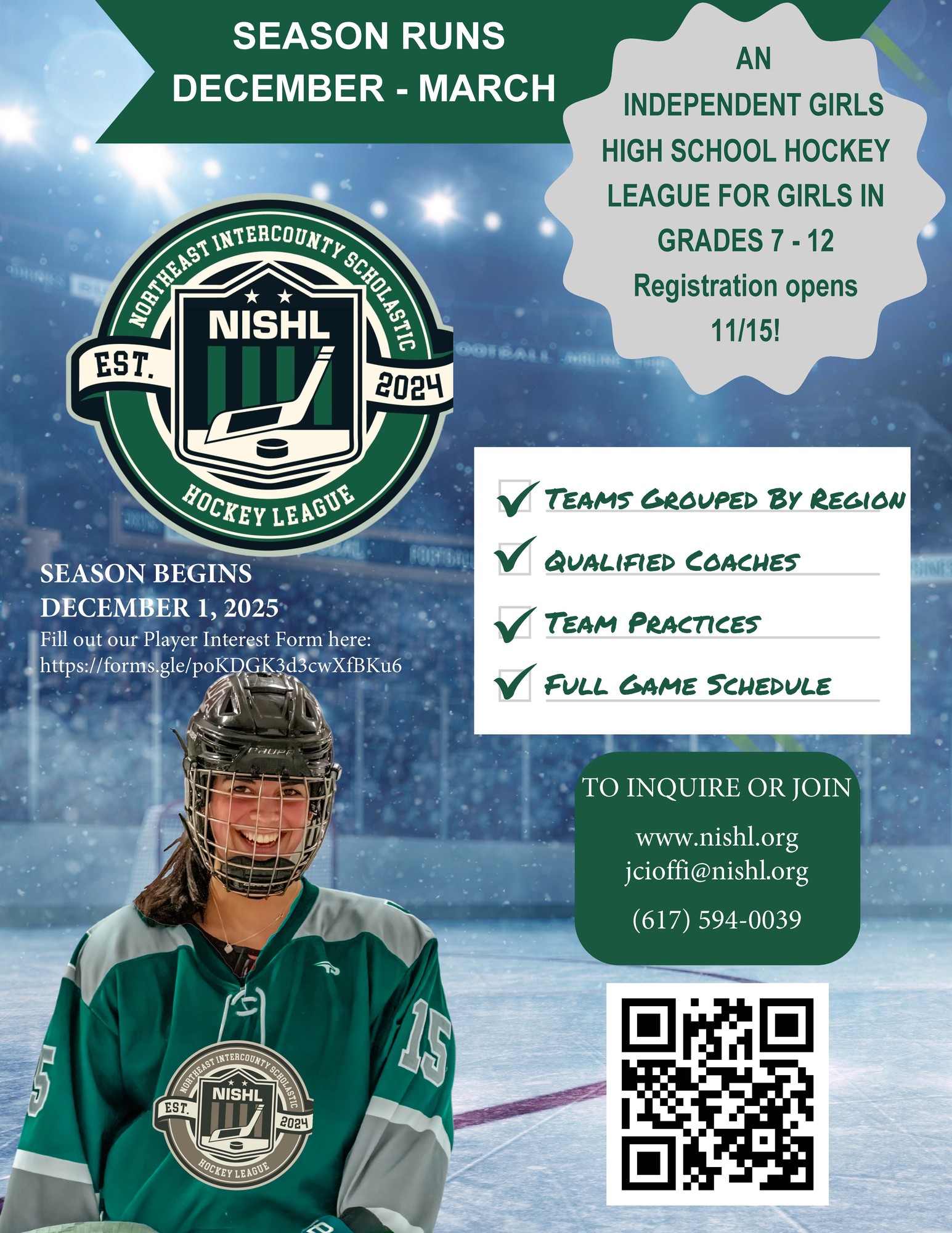 The Northeast Intercounty Scholastic Hockey League (NISHL) is a newly established women's high school hockey league in New England. This league was founded in response to our daughter, Delilah Cioffi, who highlighted the lack of opportunities for her friends to play high school hockey. She emphasized that these girls were missing out on the valuable high school experience that comes from playing a sport with their peers. Participating in school sports fosters camaraderie, enhances school spirit, and contributes to the personal and social development of students, making it a crucial aspect of their educational journey.